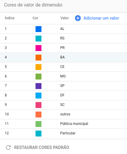 Como podemos ver, Looker Studio permite que o dashboard seja totalmente personalizado. Por padrão, a própria ferramenta atribuirá cores para as categorias (dimensões/campos) da sua fonte de dados.