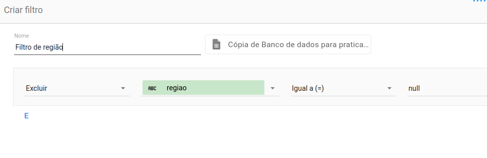 Para que o parâmetro funcione como um filtro por região, precisamos fazer com que os valores nulos (null) não apareceram nos gráficos. Faremos isso utilizando os filtros do Looker Studio.
